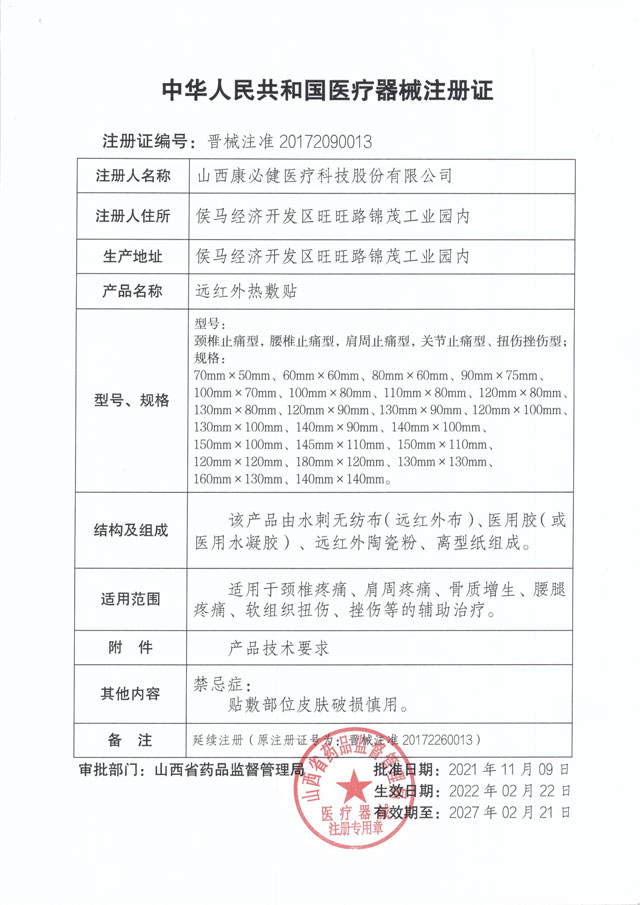 【医疗器械注册证编号/产品技术要求编号】晋械注准20172090013